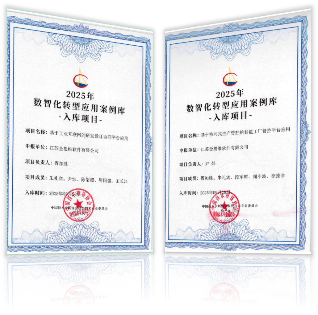 日前,中国技术市场协会发布2025数智化转型应用典型案例征集结果,金思维“基于工业互联网的研发设计协同平台应用”与“基于协同式生产管控的智能工厂管控平台应用”两案例成功入选。本次入选的两个案例,源自金思维为江南电缆与亨通力缆的多年服务实践,是经过用户企业深度应用并验证的智慧结晶。