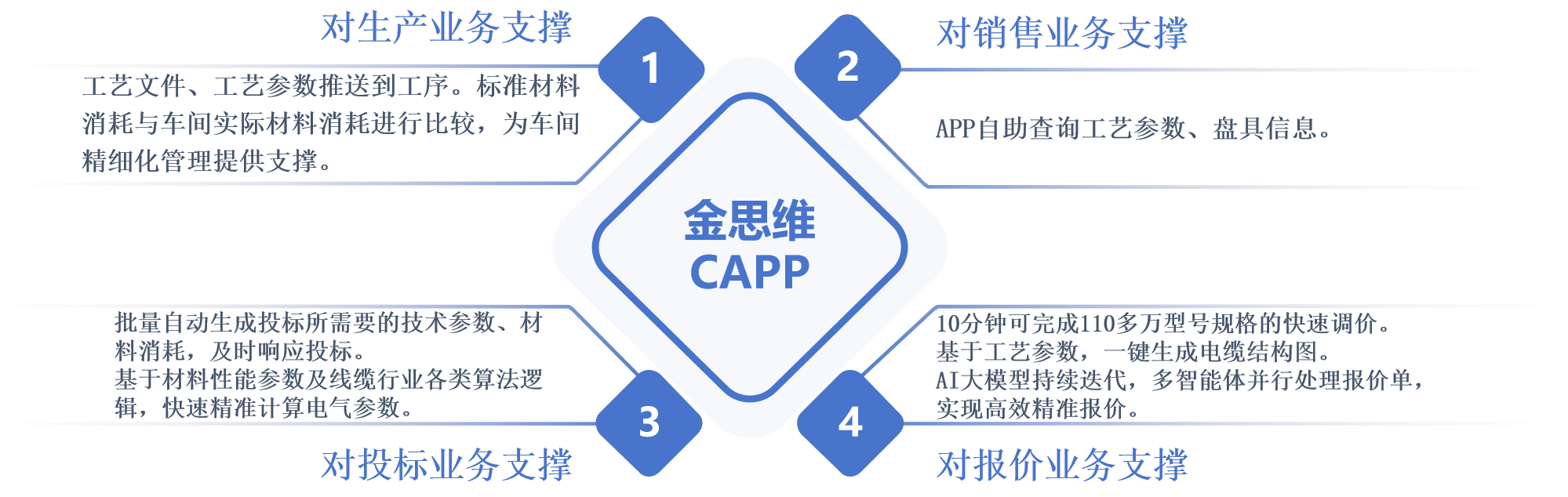 江南电缆陆续引入金思维CAPP、ERP、MES、AI销售报价、CAE等系统,构建起全链条的管理信息化体系。在此基础上,江南电缆以金思维CAPP系统为核心,打通销售、设计、制造、检验等多个业务板块间的壁垒。同时结合金思维AI大模型、成套工艺参数化设计模型,以及电线电缆结构仿真可视化工艺设计等技术,构建起高效的工业互联网研发设计协同平台,为传统制造业提供了高效协同的转型范式。
