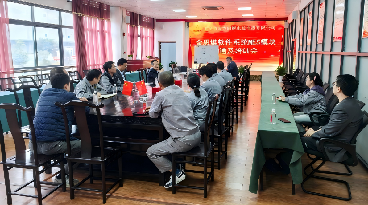 为打通企业MES系统应用“最后一公里”,金思维团队赴重庆市南方阻燃电线电缆有限公司(后文简称“南方阻燃”)组织开展了MES系统专题培训交流会。此次交流会由金思维销售总监丁小康带队,并特邀外部行业专家,就行业经验进行了分享与探讨。南方阻燃总经理杨炳生、总经理助理杨福明、生产副总何峰等人共同参与此次会议。