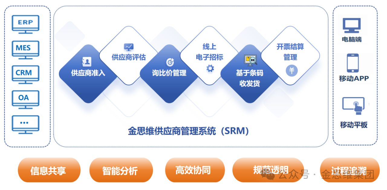 金思维SRM系统涵盖供应商管理、询比价管理、电子招投标管理以及供应商协同管理等多个子系统,规范采购流程、提高采购效率、降低采购成本,帮助企业实现采购管理的“四化”:标准化、规范化、集约化、透明化;“两协同”:内部高效协同、外部高效协同。